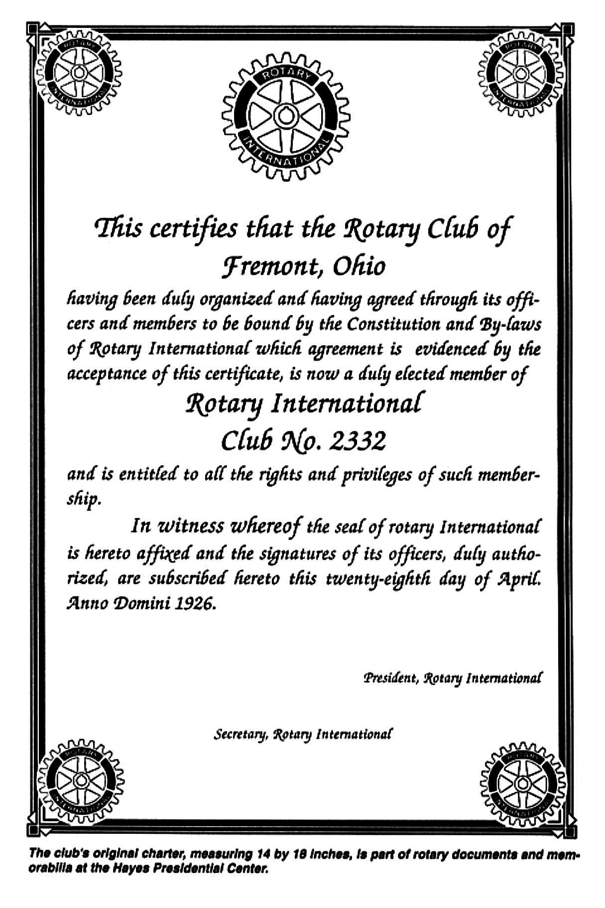ROTARY CLUB OF FREMONT, OHIO was the 2,332nd club to be admitted into Rotary International.